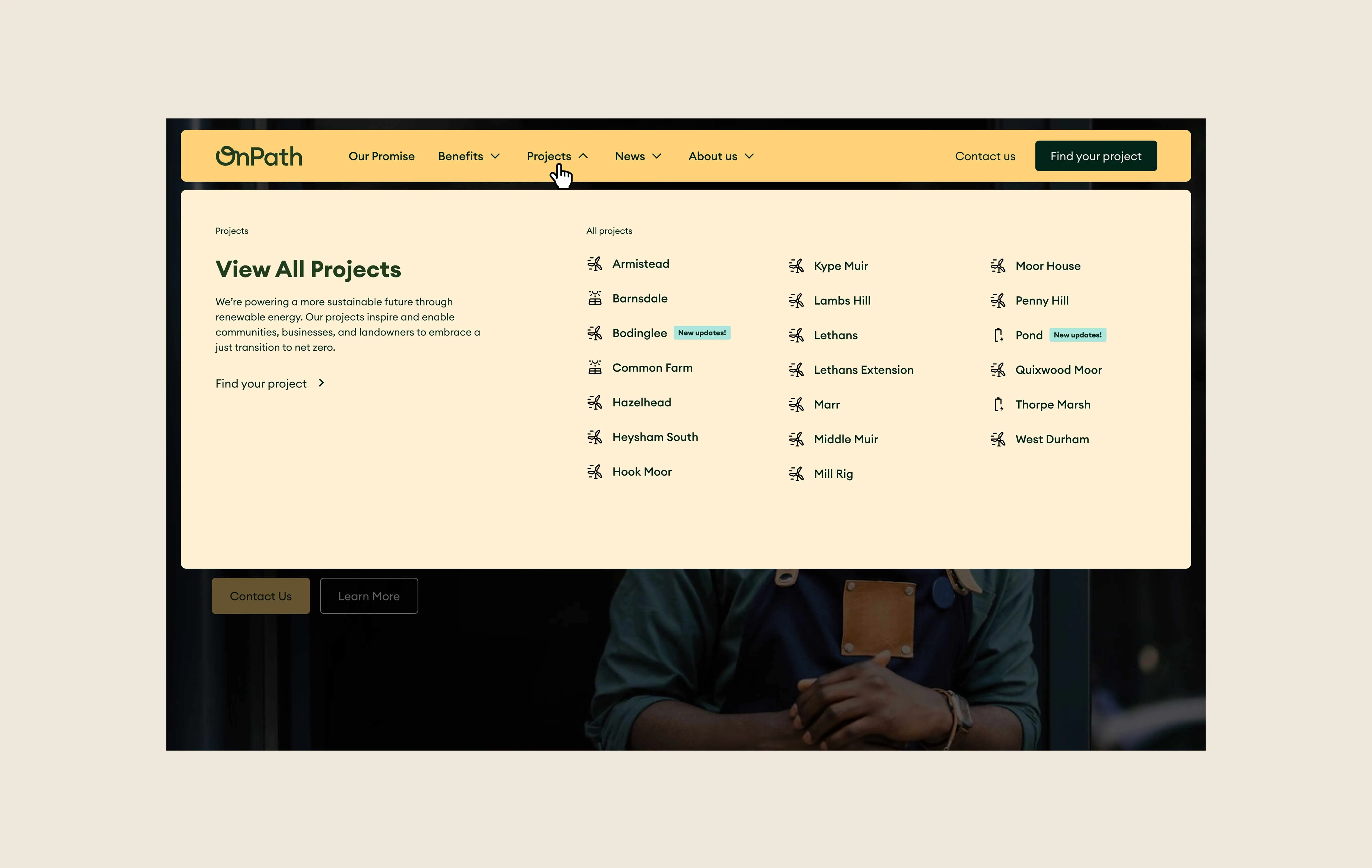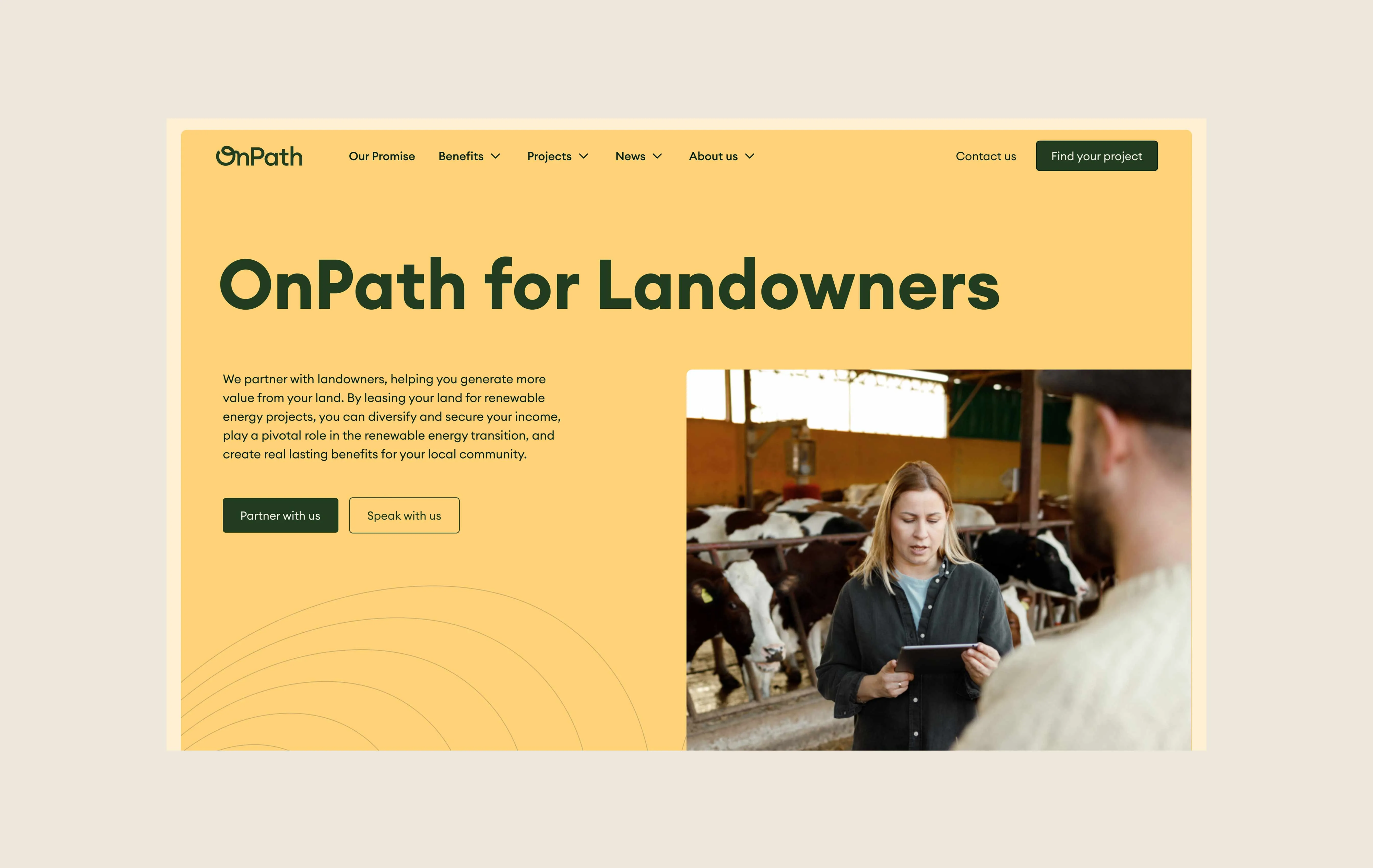 As the lead UX/UI designer at Structure, I helped bring OnPath Energy’s new brand to life online in a way that felt human, warm and genuinely connected to the communities they work with. With the move from Banks Renewables to OnPath, the goal was to keep the trust they’d already built while giving the brand a fresher, more people-first feel. I designed an intuitive, easy-to-navigate website that makes it simple for everyone — from investors to local residents — to find the information they need. Using a warmer visual palette and topographic graphic elements, the digital experience feels grounded in the landscapes where OnPath operates. The result is a friendly, modern site that reflects the brand’s belief in moving forward together toward a greener future.